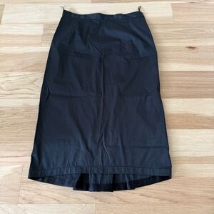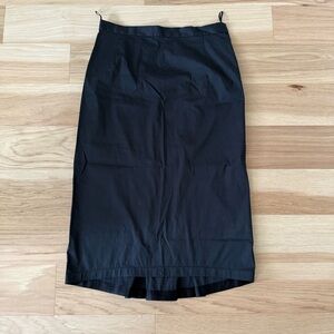 This sophisticated black pencil skirt by Prada is designed for both work and cocktail occasions. Its knee-length cut and sleek silhouette offer a polished and professional look, making it a versatile addition to any wardrobe.