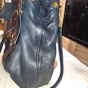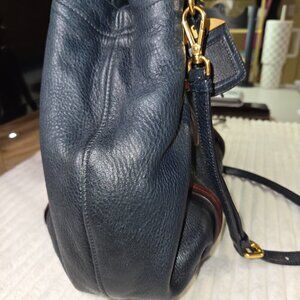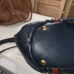 Absolutely stunning Prada Milano Cervo Antik Tote bag in buttery soft navy blue leather with dark brown accents and goldtone hardware. This bag is so much nicer in person. Can be worn on arm or shoulder with double shoulder straps and also features crossbody strap. Clean interior features a zipper pocket and snap pocket and entire purse snaps closed as well. Expansion snaps on side allow you to change the shape. Features 2 exterior leather hangtags and shoulder strap is adjustable and removable. It also includes the care card and authentication card. This purse is one of my favorites and will not disappoint.