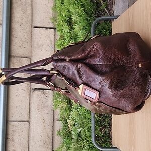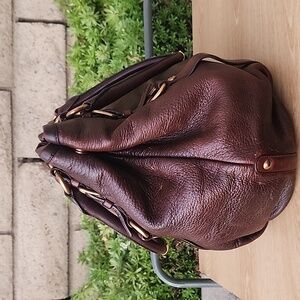 Classic Rare Prada durable army green nylon with a brown leather trim bag with a luggage tag. A timeless elegant bag that you will want to carry around forever. The exterior is clean with some marks on the nylon from gentle use- Loose shape with slight wear on the corners. Dimensions are approximately; handle drop is 10”. The interior is clean with one zipper pocket & 1 Slip pockets- overall excellent used condition.