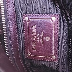 Classic Rare Prada durable army green nylon with a brown leather trim bag with a luggage tag. A timeless elegant bag that you will want to carry around forever. The exterior is clean with some marks on the nylon from gentle use- Loose shape with slight wear on the corners. Dimensions are approximately; handle drop is 10”. The interior is clean with one zipper pocket & 1 Slip pockets- overall excellent used condition.