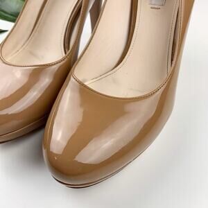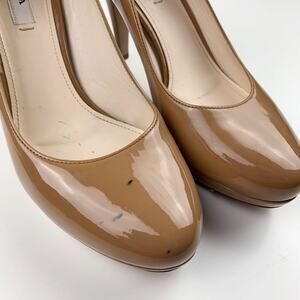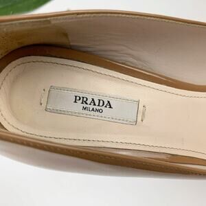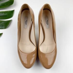 Prada Milano heels in women's size 37 US 7. Tan color patent leather. Platform sole. Made in Italy. Wear to the footbed and marks in several places on the leather. Please see pictures.