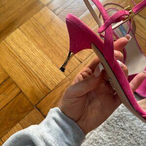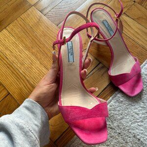 Prada Milano hot pink suede strappy sandals with slim gold-tone stiletto heels a