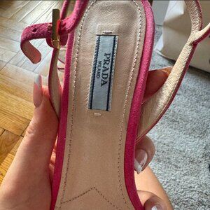 Prada Milano hot pink suede strappy sandals with slim gold-tone stiletto heels and ankle buckle closure. Features a chic square toe and minimal strap design for a sleek, feminine silhouette. Made in Italy, size 38 (fits like US 7.5–8).
