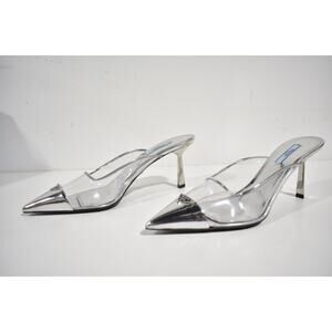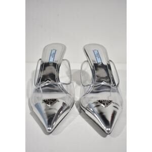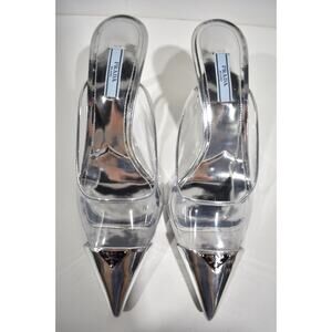 Prada Modellerie Clear PVC Silver Backless Pointed Sandal Mule Heel Pump 37.5
