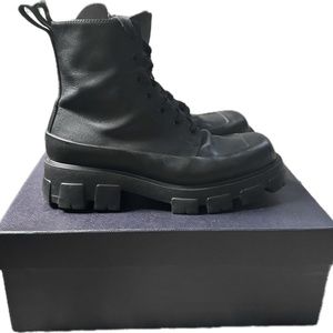 A rubberized shell wrapping the upper provides textural contrast to the smooth leather of a rugged yet refined combat boot set on a superchunky lug sole.