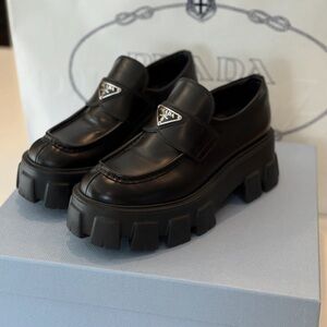 The Prada Brushed Monolith Loafers in size 37 are a stylish and high-quality pair of women's shoes. Made from black leather, these loafers exude elegance and sophistication. The flat design and loafer style make them versatile for both casual and formal occasions, perfect for adding a touch of luxury to any outfit. The Prada brand ensures both fashion-forward design and top-notch craftsmanship, making these loafers a must-have addition to any woman's shoe collection.