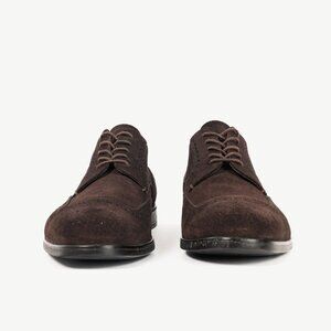 Circa 2012, these Italian-made derbies from Prada are crafted with a soft suede in a Moro brown, and feature flat stacked block heels, closed rounded toes, perforated wingtip detailing, front lace-up fastening, leather lining, and rubber outsoles.