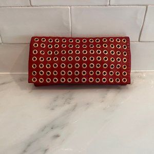 Authentic, PRADA, nappa leather Cluch bag, done in the softest leather hand, featuring golden grommets on front and back. Golden hardware, magnetic opening, inside pocket. Red satin lining. Grommets are all intact, leather may have light scuffs, including corners, but very minimal. Inside lining is IN Good condition. GREAT overall condition and guaranteed authentic.