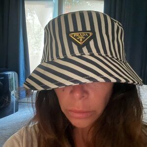 Chic bucket hat with black and white stripes. Ideal for outdoor fun. Prada black and white used twice I do not have dust bag as I used it in Europe got it eBay no receipt so see low price. It is so cute! Got lot of compliments