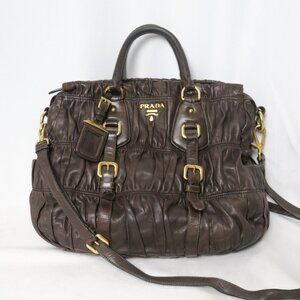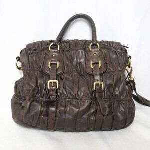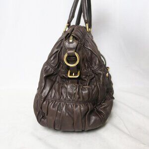 Features: brown, ruched lambskin leather, gold-tone hardware, rolled handles, pleated details, logo jacquard lining, zip closure.