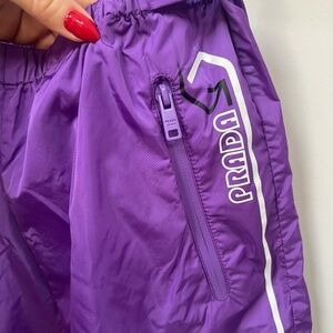 Prada violet nylon track pants with white logo strip detail on one leg.