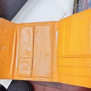 Elevate your style with this vibrant orange quilted wallet from Prada. Perfect for any occasion, this wallet combines luxury and functionality. Nylon exterior, lamb leather interior, comes with worn box and authentic tissues. View all photos as they are apart of description and is exact item you will receive. color may differ in different lighting, mustard orange.. needs a little cleaning, light wear throughout but 100% functional,has vintage smell. wrapped in dryer sheets and silica and it gets a little less strong everyday.