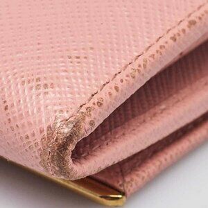 The exterior leather has rubbing and wear along the bottom corners and the edges of the flap. The back of the wallet has rubbing, scuffing and wear. The goldtone hardware shows scratches, but remains bright. The interior lining has spots, rubbing and signs of use throughout.