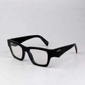 Classic sophistication meets modern functionality in the Prada PRA06S eyeglasses — a refined square silhouette designed for everyday wear with elevated edge. This unisex model (color code 16K08N) features a sleek black full-rim frame crafted from high-quality acetate, paired with clear lenses that include a blue light filter for digital-age comfort and eye protection.