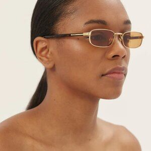 Modern elegance meets vintage influence in the Prada PRB54S sunglasses, featuring a sharp rectangle silhouette with warm-toned dark honey lenses. The lightweight gold metal frame delivers a refined, architectural feel, while the bio-polyamide lenses offer 100% UV protection and an eco-conscious edge.