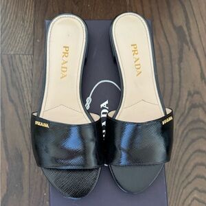 Chic black leather slides with a glossy finish. Features gold Prada logo accents. Can provide more photos if needed.