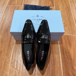 Made from glossy patent leather, these loafers from Prada come in a stylish pointed-toe design. They are adorned with the label's iconic triangular logo plaque, which embodies simplicity, elegance, and quality.