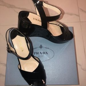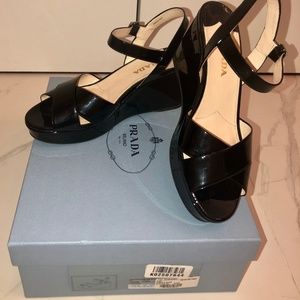 Prada black patent leather wedges. WORN ONCE. Like brand new.