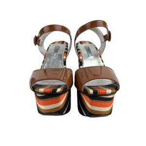 Prada Patent Striped Wedge Sandal, Cognac size 8.5