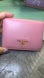 Chic Prada wallet in pink leather. Features gold logo detail. Compact and stylish. Some coin stains and fading on the P in the logo