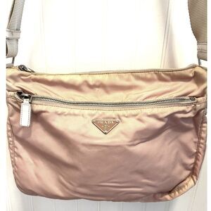 Prada nylon handbag with front zipper pocket and interior pocket. The bag has fading around edges and corners, but it's still a PRADA, and it still looks good. The gray straps are still in very good condition, and the zippers all are zippy. The retail price for these bags is well over $1000, and they can be dyed if you'd like to make even better!
