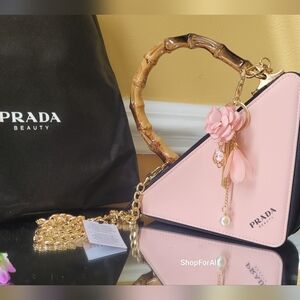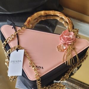 Stylish Prada crossbody bag. Features pink and black design. Gold chain strap. Bamboo handle. Elegant floral charm.
