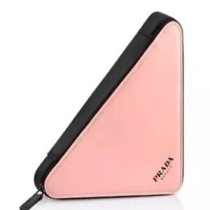 Stylish Prada clutch or cosmetic bag in a unique triangle shape. Features a pink front with black accents. Perfect for a chic look.