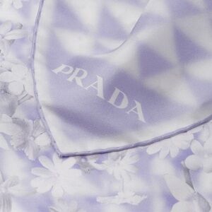 Chic Prada silk scarf in lilac. Features an intricate design.