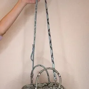 Prada blue and brown python top handle bag w/ removable crossbody strap and dust bags.