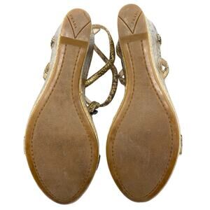 Prada Linea Rossa T-strap Wedge Sandals size 36 1/2/US 6.5 in metallic gold snakeskin-embossed leather with tortoise acetate buckles and rope platform. Rubber soles. They have minimal wear, no flaws and are in excellent preowned condition.