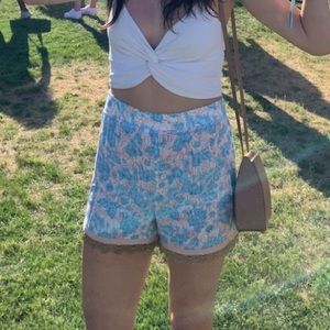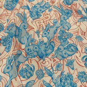 Prada shorts with a unique and fun rabbit print(blue and pink). Gorgeous gold chain mail detailing at the hem. Zipper on side. Worn just once!