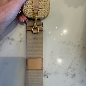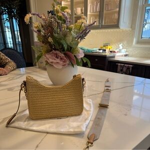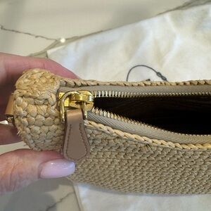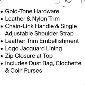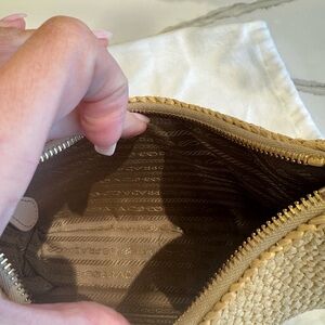 Elegant Prada crossbody bag in a shimmering gold tone. Features a stylish chain strap and signature logo detail.