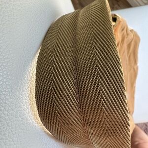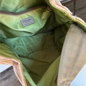 Authentic. Rare, sought after Camel-Gold color. Gold velvet exterior + green interior — was part of Prada’s late-1990s “Sport / Linea Rossa” Velvet Series, which featured jewel-toned crushed velvets. Collectors tend to value the lighter metallic-tone velvets like this one because they show the plush texture and shimmer that make this line distinctive. Clean inside & out. Some light preloved wear on exterior with more wear along top of bag as seen in photos. For those who want a rare, unique bag, this could be for you, to use or to add to a collection.