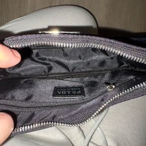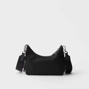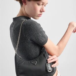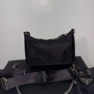 Chic Prada shoulder bag in black nylon. Features a stylish chain strap and iconic logo detail. Perfect for elevating any look.