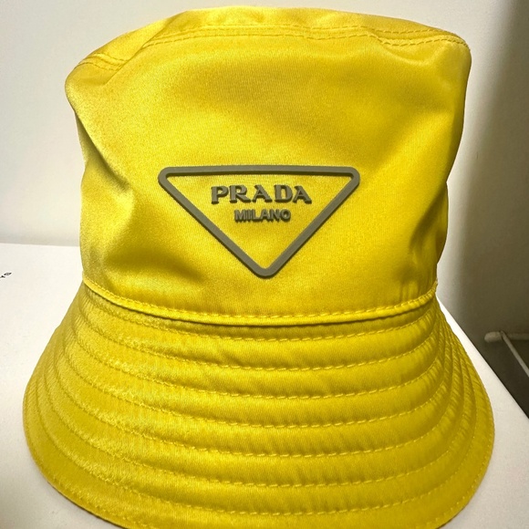 (NEVER WORN, brought wrong size) Prada . Triangle logo. This bucket hat is made from Re-Nylon, a regenerated nylon yarn produced through a process of recycling and purifying plastics recovered from the ocean, as well as fishing nets and textile fibers.