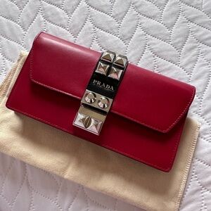This exquisite Prada clutch in vibrant red is crafted from luxurious textured leather, featuring a chic flap closure and a striking silver chain strap. The elegant design is accentuated by a decorative gold embellishment, making it a perfect accessory for any sophisticated occasion.