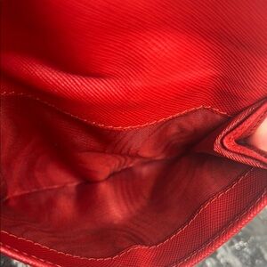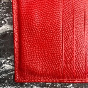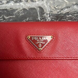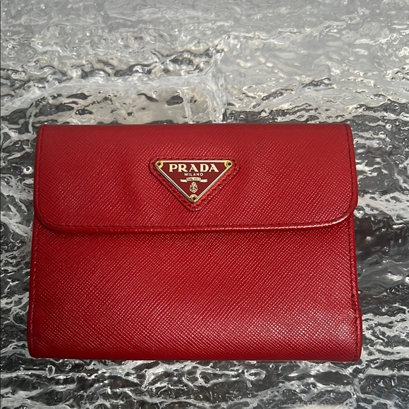 This Saffiano leather wallet with the metal logo on the front flap has a compact, modern design.