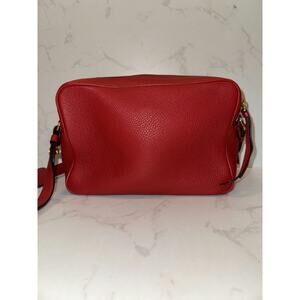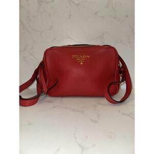 This chic Prada crossbody bag is crafted from vibrant red textured leather and features elegant gold-tone hardware. It is in excellent condition with only minor wear on the strap. Perfect for everyday use or special occasions.