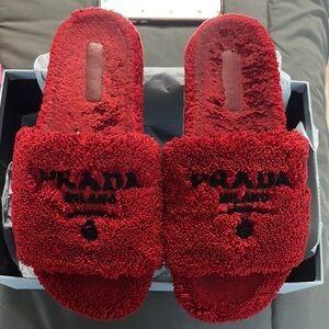 Used Chic Prada sandals with a fuzzy red design. Ideal for a trendy look.