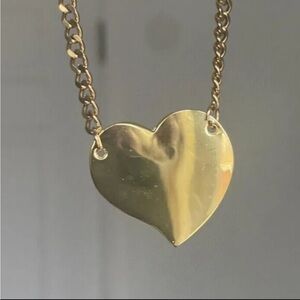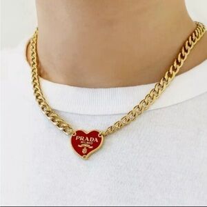 The repurposed heart necklace features an authentic red and gold heart logo plaque