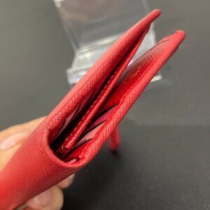 Red saffiano leather with tonal and gold hardware. Eight card slots. ID window. One bill pocket. Exterior zip pocket. Overall very good preloved condition. There are some smalkl rub marks on the top corners. Inside is clean. Zipper works fine. Please take the time to look at photos to determine condition. Reach out for additional information.