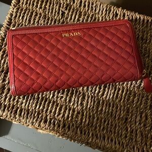This Prada wallet features a striking red hue and a luxurious quilted design, crafted from high-quality leather for a sophisticated look. Its elegant gold logo adds a touch of refinement, making it a standout accessory for any occasion.