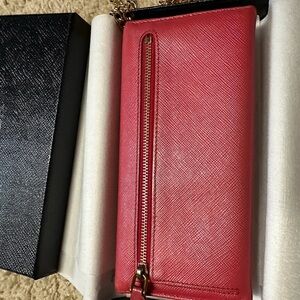 Elevate your style with this elegant red leather wallet from Prada. Perfect for any occasion, this chic accessory adds a touch of luxury to your ensemble.