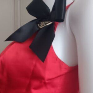 Dress is made of silk material; it is sleeveless, layered and pleated. Round neckline and back zipper, Also, it features a signature logo Prada brooch with black satin bow