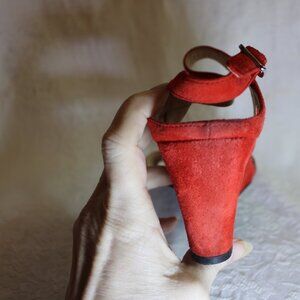 These gorgeous tomato red suede Prada wedge sandals are a size 36.5 or 6.5. They have been worn only once. They are fantastically comfortable but did not compliment the outfit I purchased them to match. So they deserve to have a new life!