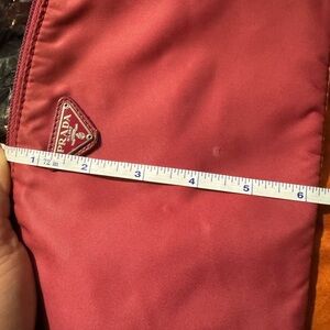 This Prada cosmetic bag in a striking red hue is crafted from durable nylon, featuring a quilted design that adds a touch of elegance. Its dome-like shape and zipper closure make it a practical choice for organizing your beauty essentials. Perfect for travel or daily use, this bag combines functionality with luxury.