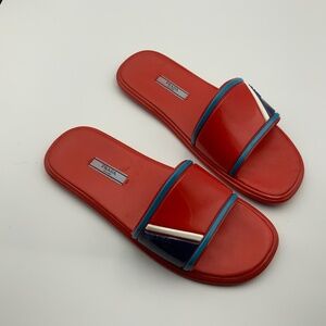 Stylish Prada sandals in vibrant red. Features blue accents and sleek design. Perfect for casual wear.
