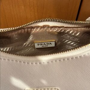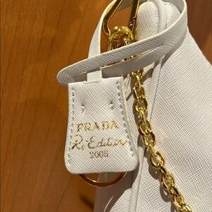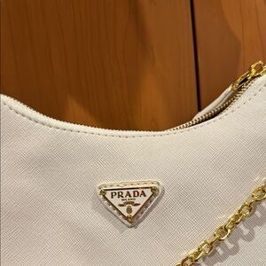 Prada re-edition bag. Featuring a chic white design complemented by luxurious gold accents, this bag is perfect for any occasion. The adjustable strap and additional pouch add functionality to its sophisticated look.
