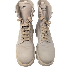Prada Rocksand Light Beige Washed Denim Canvas Combat Lug Boots Size EU 38.5