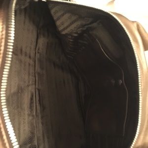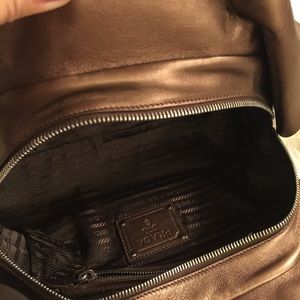 Used genuine Prada ruffle bag purchased from Saks. Some scratches on the front and back as shown in photo. Soft napa leather in metallic bronze. Dust cover, price tag, and authenticity card present.